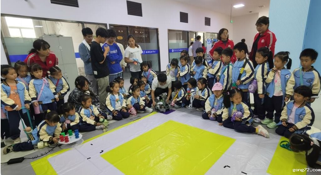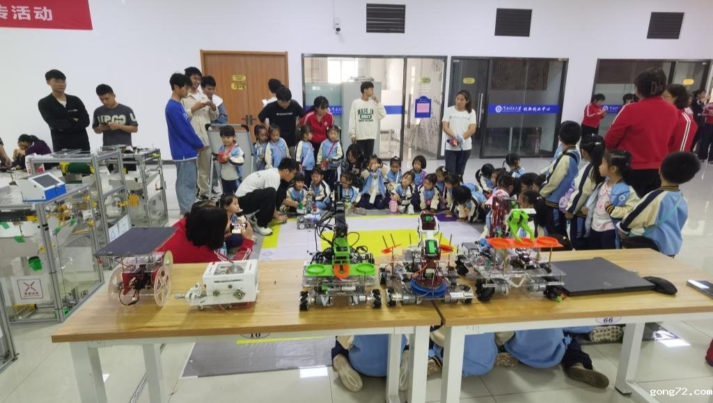 活动现场,学院老师和创客同学通过图片资料、现场讲解、实物展示等形式,为小朋友们在搬运机器人、窄足机器人、巡线小车、独轮平衡、飞行器、智能物流搬运以及生活垃圾智能分类等12个项目方面奉上了一份科普大餐。现场的小朋友都非常兴奋,一双双充满好奇的眼睛,生怕错过每一个精彩时刻。
